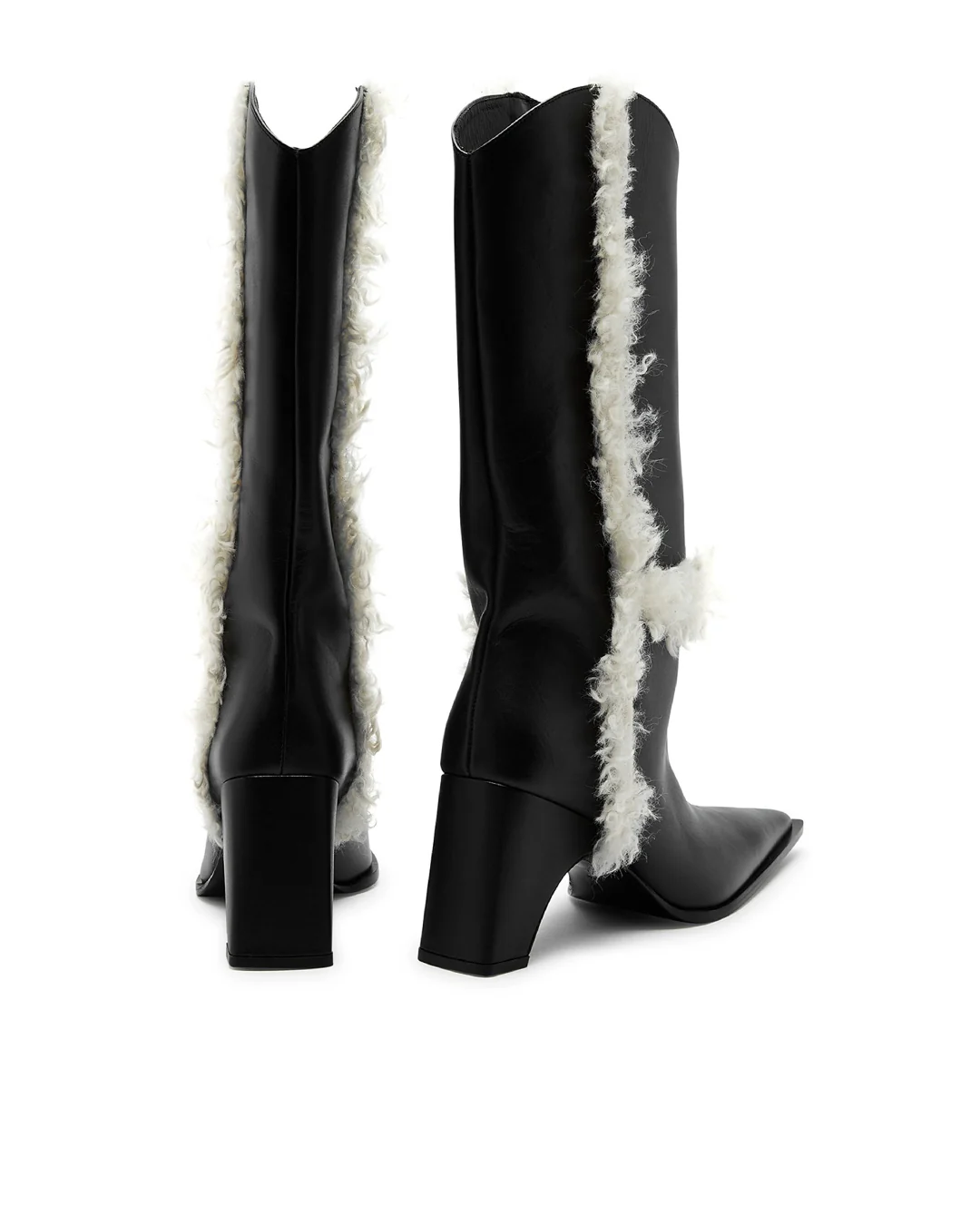 Mid-calf cowboy boot in supple black leather with faux shearling trim. The Bridge Cowboy Boot is a twist on a classic style. It has an arched block heel set at a slanted angle, lending the arch or ābridgeā of the sole a sweeping look that flatters the foot. It is crafted from soft prestige leather with a faux shearling trim that runs from top to bottom and around the ankles and top rim. Size chart: EU.
