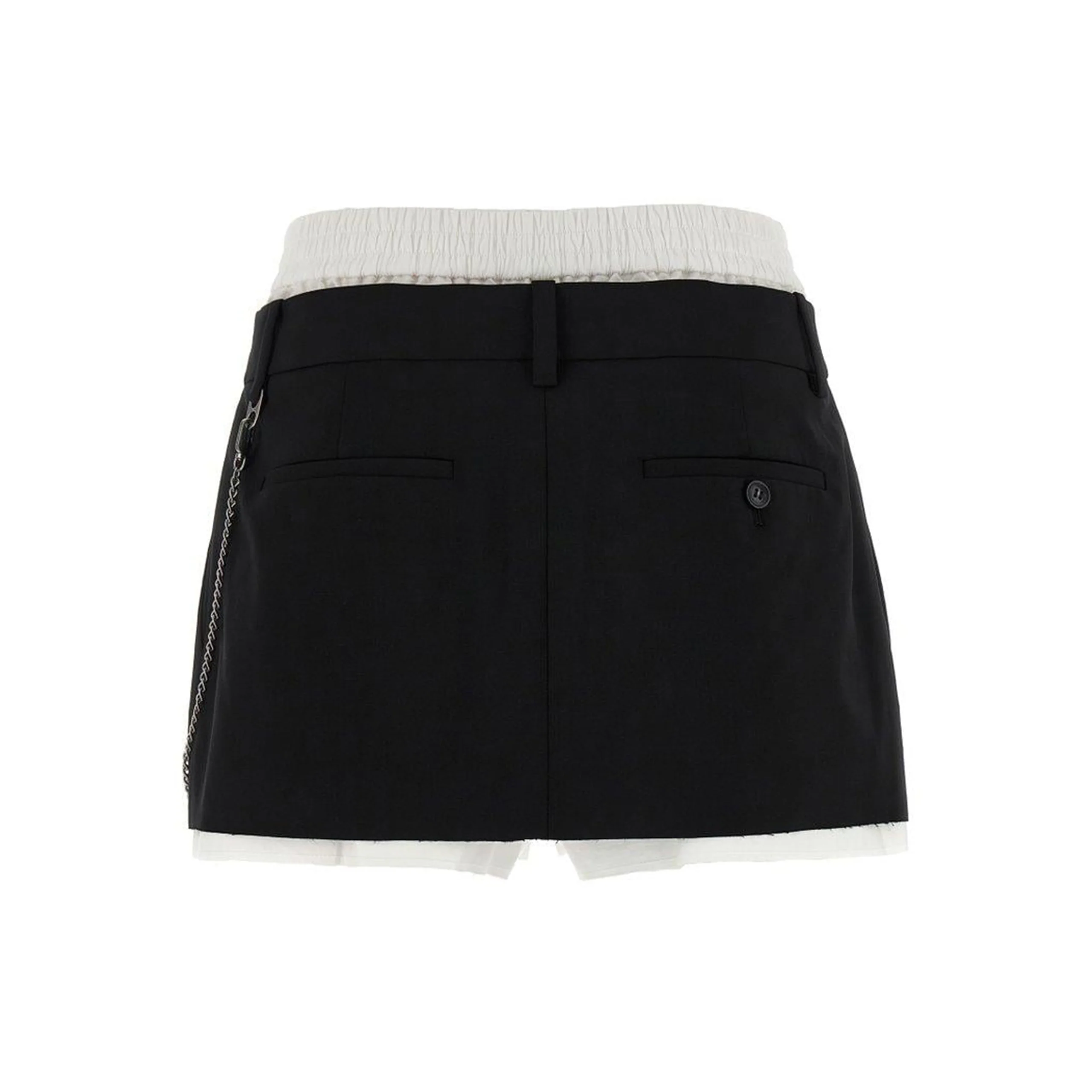 The Pre-Styled Skort With Chain by Alexander Wang in Black/White offers a bold fusion of tailored sophistication and sporty edge. Crafted from a structured wool blend, it features a signature elasticated boxer-style waistband with a logo patch, creating a striking contrast against the double-pleat front. A detachable chain belt with a branded key adds a statement finish, while practical details like side and back welt pockets, belt loops, and a raw-cut hem complete the look. Fastened with a front zip and hook closure, this skort redefines contemporary dressing with the brand's signature attitude.