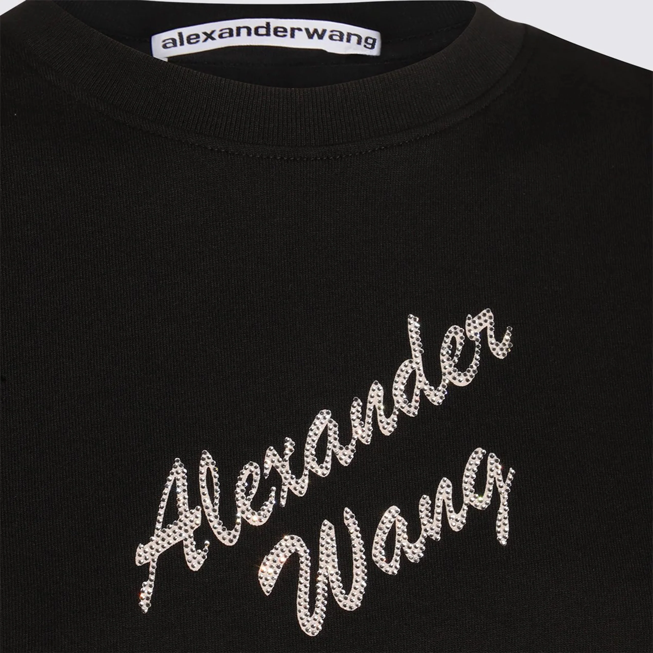 The Shrunken Tee With Logo by Alexander Wang in Black captures the essence of effortless sophistication with a modern edge. Crafted from premium cotton, it offers a smooth, refined texture and a flattering shrunken silhouette that gently contours the body. The standout feature is the embellished "Alexander Wang" logo on the front, rendered in an ornate script and adorned with light-catching hotfix details that add a touch of subtle glamour. Set against a minimalist black backdrop, this T-shirt delivers timeless style with a contemporary twist.